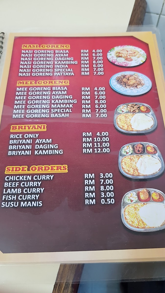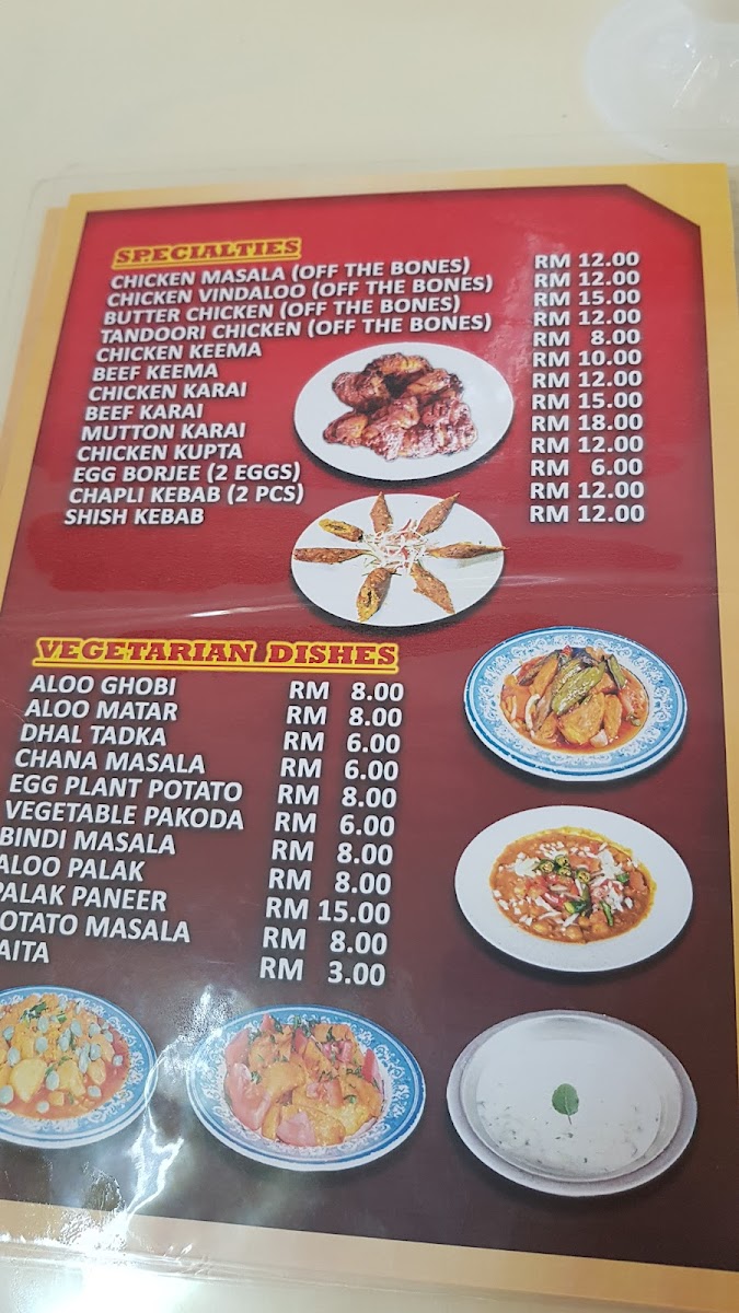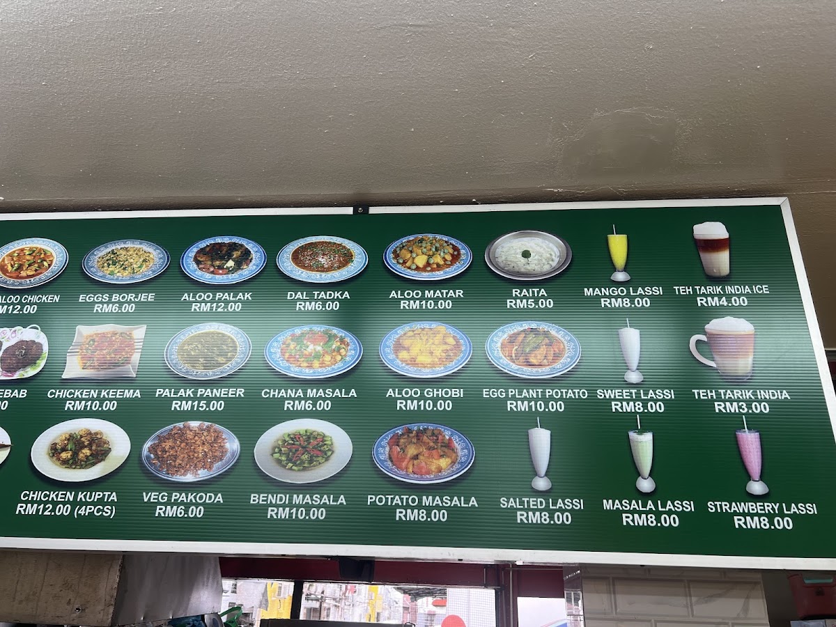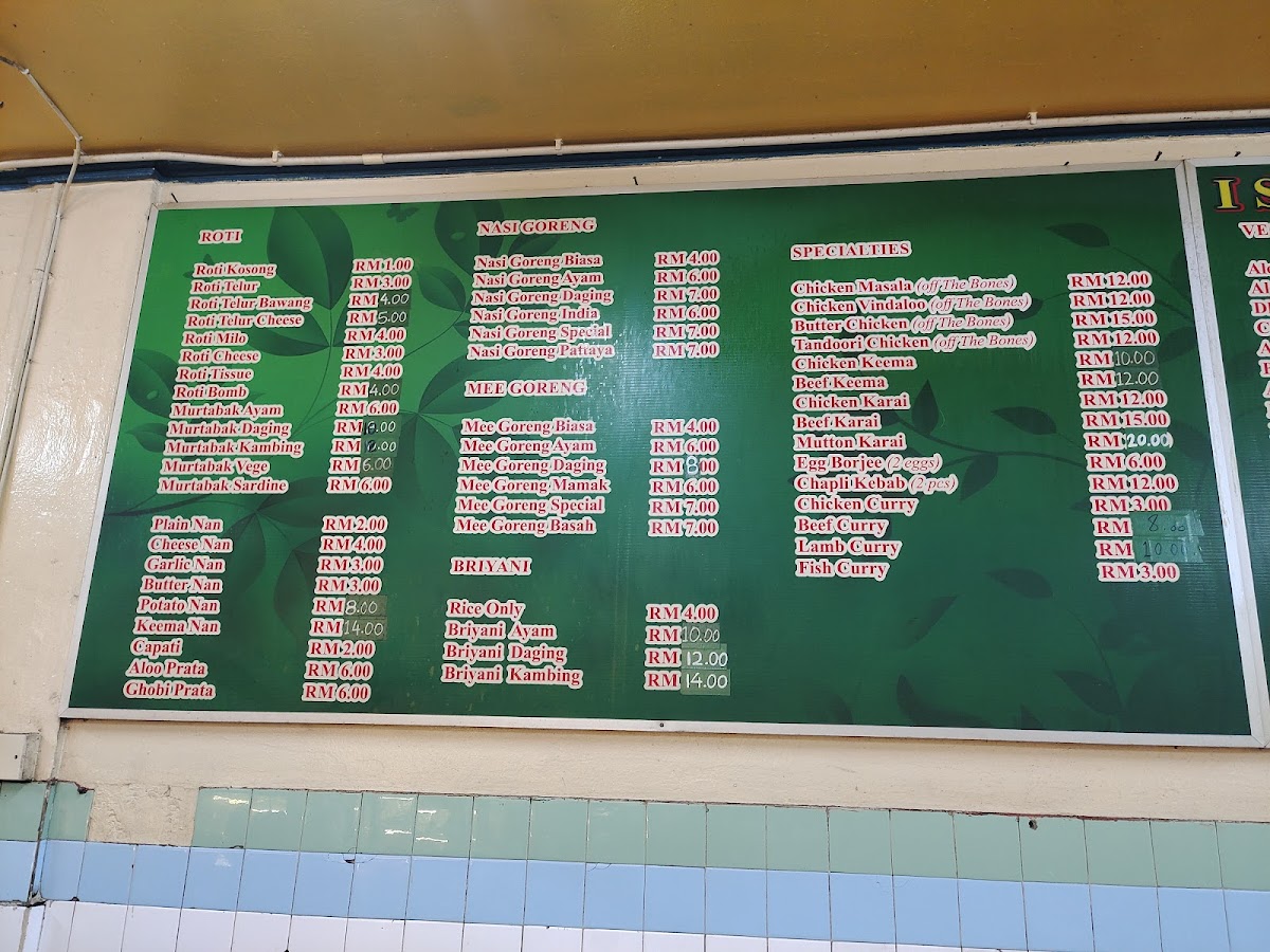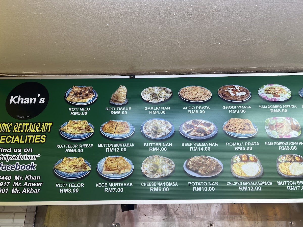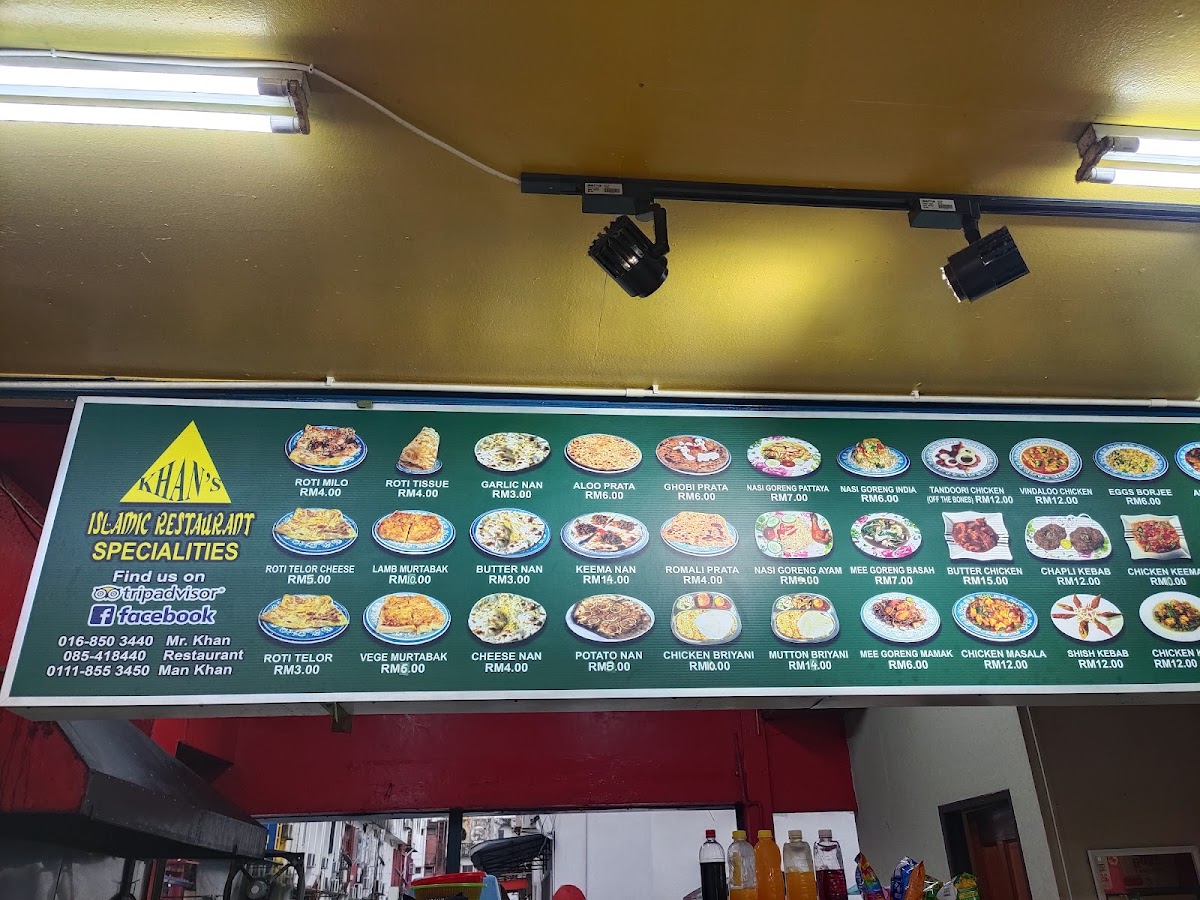 Khan's Islamic Restaurant offers a rich and diverse menu, catering to a wide range of tastes and preferences. For vegetarians, options like Chana Masala, Bindi Masala, and Aloo Ghobi are available. The Roti Planta selection includes choices like Roti Planta Milo Cheese and Roti Planta Susu Milo. If you're craving something stir-fried, their Kuey Teow Goreng variety features options such as Kuey Teow Goreng Kambing and Kuey Teow Goreng Daging. For bread lovers, the Roti Canai includes Roti Bawang and Roti Kosong, while Murtabak fans can choose from fillings like Murtabak Kambing and Murtabak Ayam. The restaurant also serves flavorful Briyani dishes, including Biryani Ayam Goreng Besar and Biryani Mutton Shank. For a classic accompaniment, there are different Capati / Paratha options such as Plain Capati and Aloo Prata. The Specialties section features rich dishes like Chicken Vindaloo and Butter Chicken Masala. The Roti Cheese offerings, including Roti Cheese Milo and Roti Cheese Meleleh, are perfect for those with a cheesy craving. For noodle lovers, Mee Goreng comes in several variations, including Mee Goreng Mamak Daging and Mee Goreng Special. The drink selection, including Mango Lassi and Sweet Lassi, complements the savory dishes. Lastly, the restaurant offers a variety of Nasi Goreng options like Nasi Goreng Kampung and Nasi Goreng Daging, along with indulgent Roti Tissue choices such as Roti Tissue Milo and Roti Tissue Chocolate. With so many options, Khan's Islamic Restaurant ensures that there's something for everyone to enjoy.